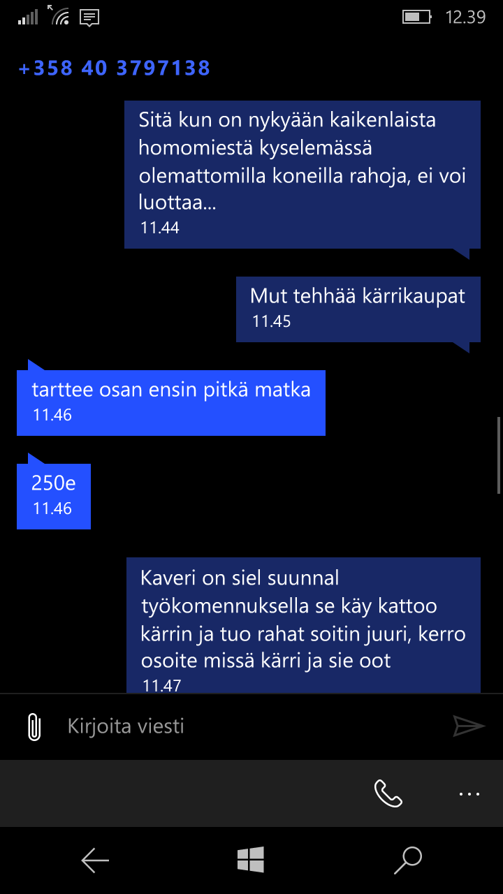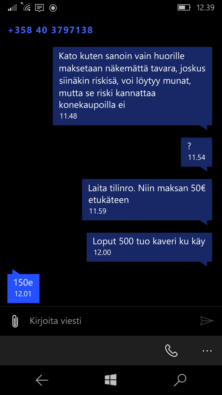 Perkule, yks mulukku numerosta 040 3797138 tai +358403797138 koetti saada olemattomalla tavaralla rahoja. ohessa kuvakollaasi huijarin ja minun viestittelystä... kova oli yritys, saada rahat katteetta.