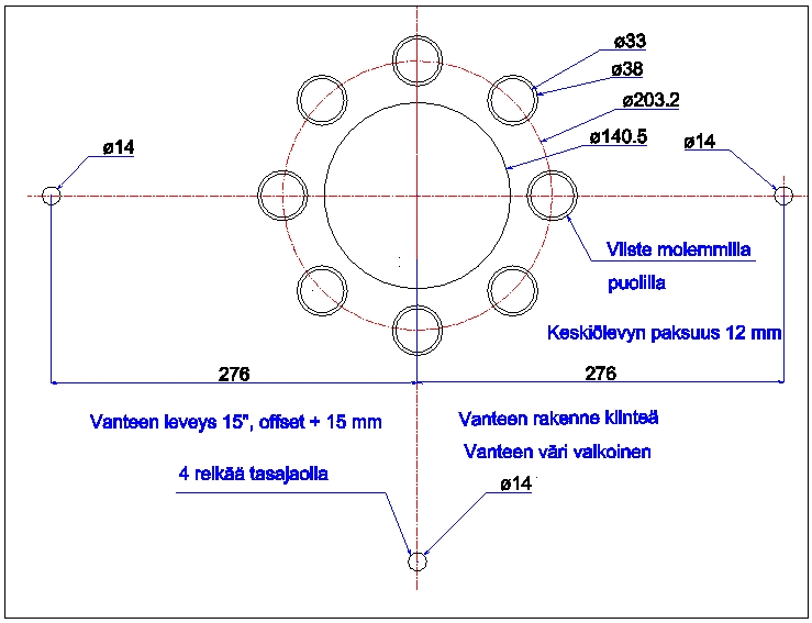 Mitat rullamitalla otettu, noin pulttijako / keskireikä