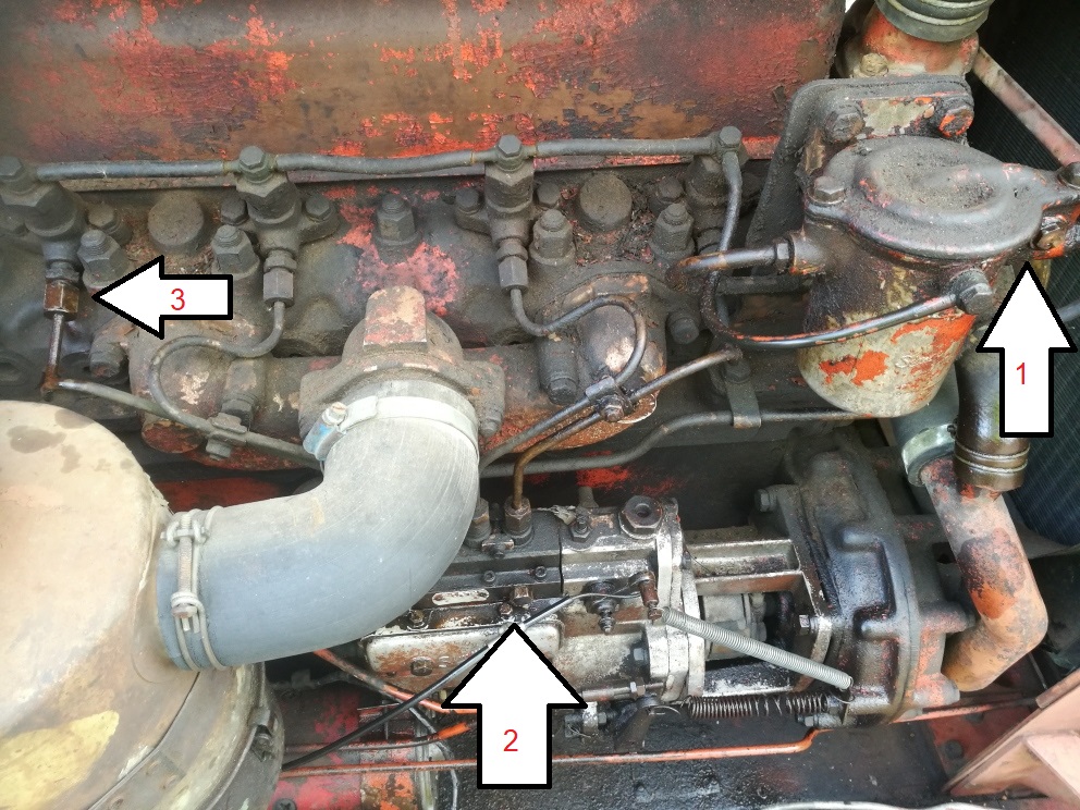 Avasin 1-nuolen kohdalla olevan ilmausruuvin (?) ja pumppasin kunnes pelkkää diisseliä valui pitkin pihoja. Avasin diisselipumpun (nuoli2) ilmausruuvin ja pumppailin kunnes diisseliä valui pitkin naapurinkin pihoja. Koitin lähteekö, ei.